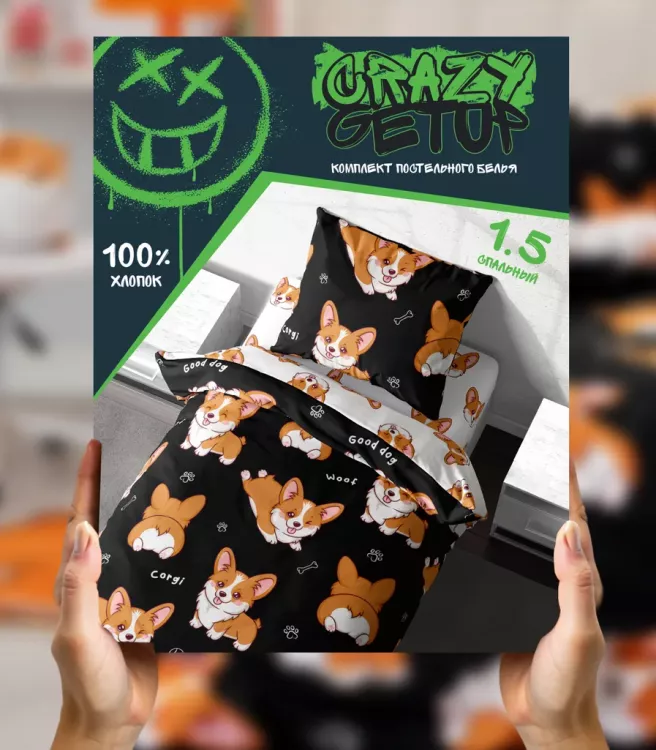 "Crazy Getup" Комплект постельного белья "Корги" 1,5сп, 50х70см, поплин